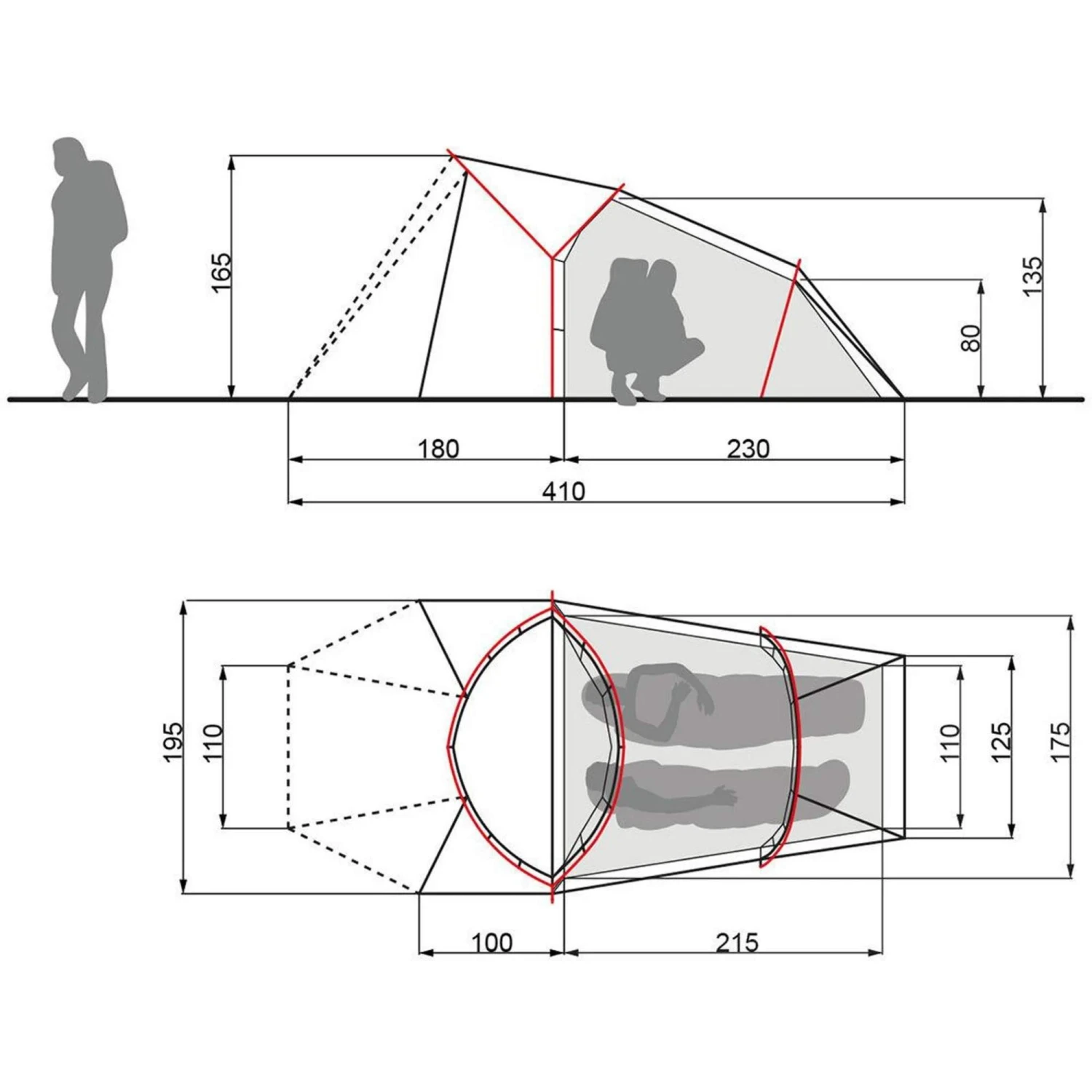 - Geräumiges Tunnelzelt für 2 Personen